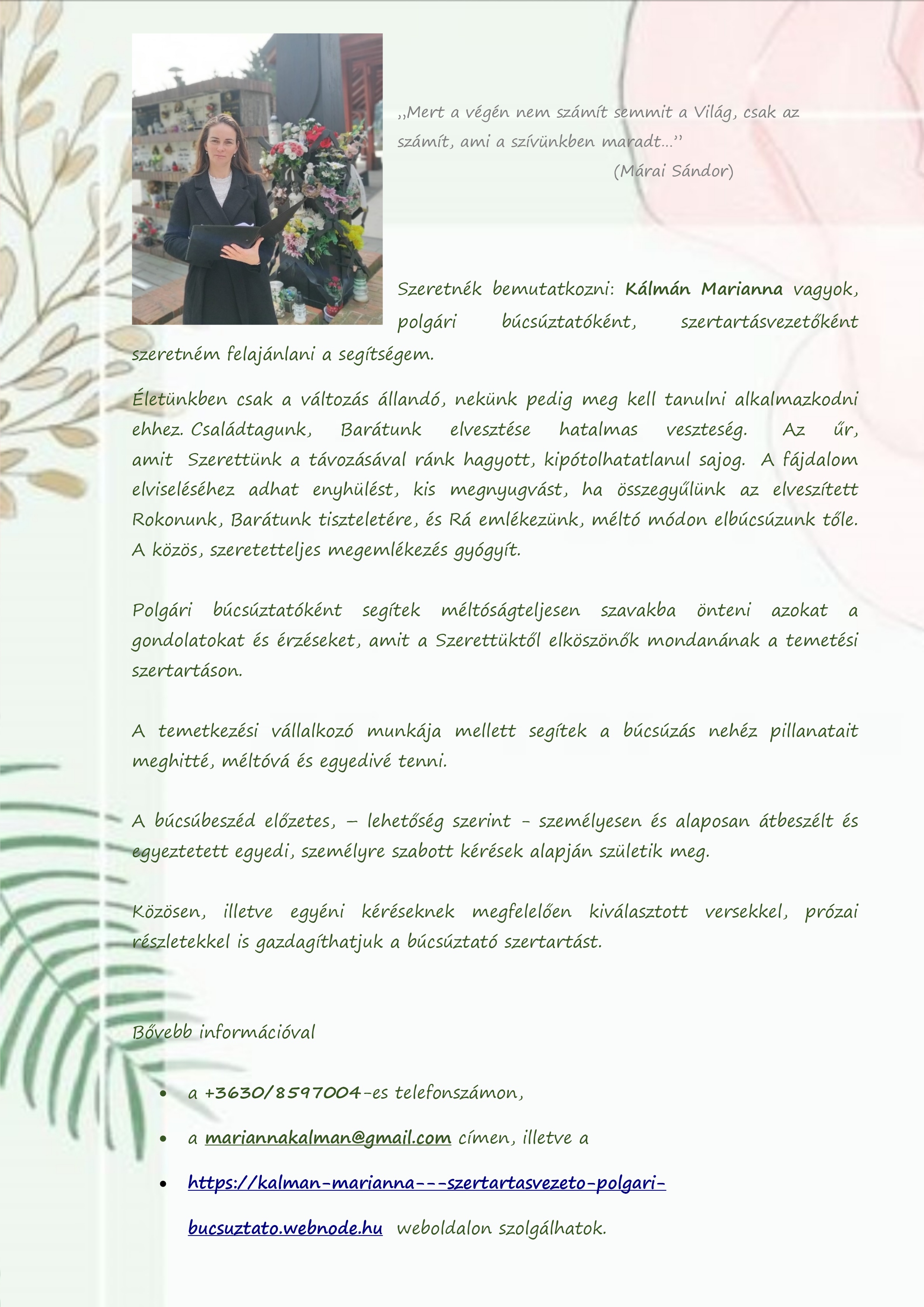 - Temetési szertartás: ravatalozás, gyászzene szolgáltatás (klasszikus, modern) hozott hanganyag